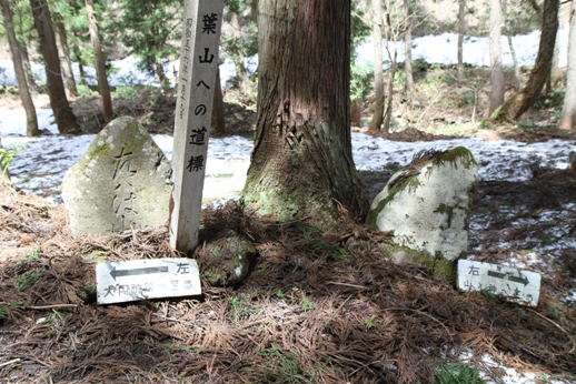 湯野沢からは法師川に沿って,岩野からは獄山山頂を通って登り,七五三掛けぶな道,御池尻を経て葉山大円院山門に入る道です。早くから開かれた参道であったようで,湯野沢地内の参道には「鬼甲の隠れ道」の名をとどめていたり,一杯清水というところには吹雪にあい凍死した山伏の碑や,杉の平の翁と娘の言い伝えがあります。また桂木沢の不動尊の伝えや,吹腰宿,権平宿,吉原宿,荊蕪宿等の宿坊の地名が伝わっていたり,他にも参道周辺には修験道場の地名を残す山々が並んでいます。注連(しめ)掛けブナのコースは未整備ですが,葉山の参道と道標で紹介する道標や謎のお墓などが残されており,ぜひ整備してほしい登山道であります。