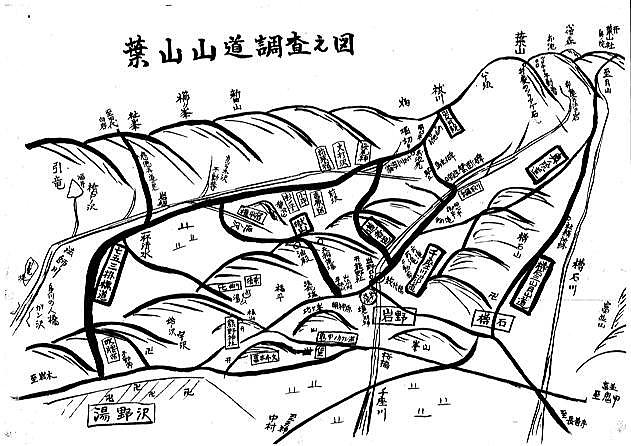 父が実地調査て作成した葉山の参道の地図です。母の話では朝早くからでて夜遅く帰ることもしばしばあり,大分心配したそうです。絵図のようなものですが,実際に歩いたものだけが作成できる実感のこもった地図であると思います。
