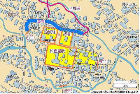 熊野三郎の築いた城は今の楯地区と下小路地区にありました。約20間四方に土手を作り、土手のまわりには堀がありました。今でも宝地区の横宿に、堀ばたの地名と堀の跡と土手の跡が残っています。この堀は内堀で、外堀は宝川と滝の沢が合流する前田関の所までの2つの川でした。この前田関で水をせきとめると水が川にたまって堀となったのです。
