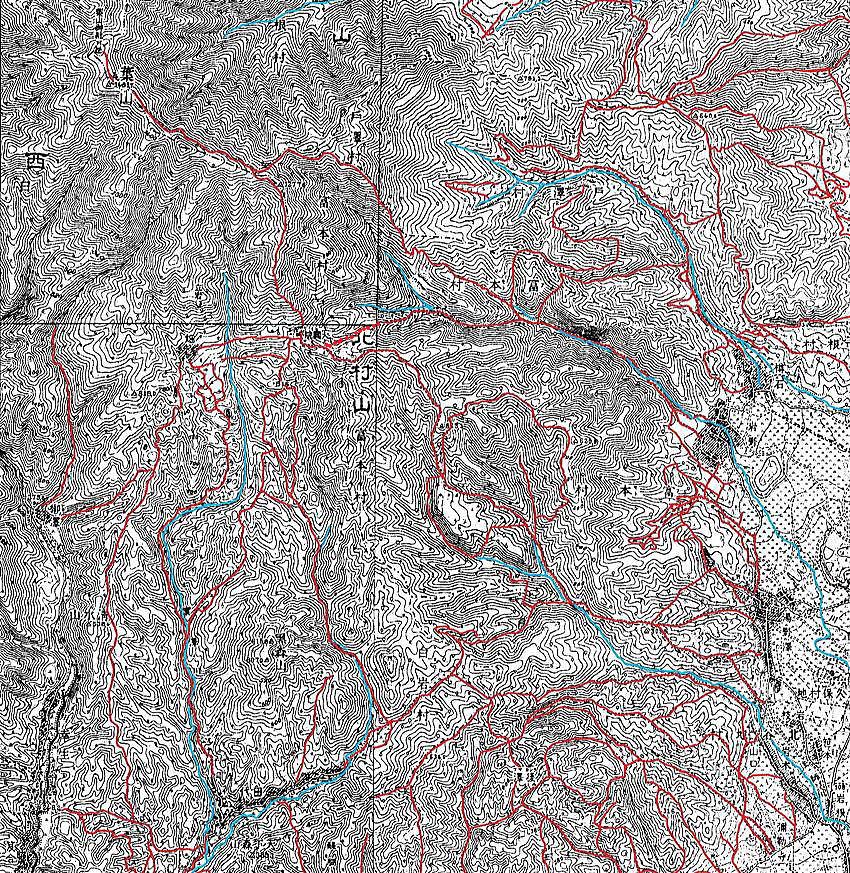 ほぼ原寸大表示です。赤い線は道路,水色は川です。線を入れたのは私ですので間違っているところもあると思います。ごめんなさい。ごらんのとおり,昔は葉山大円院と周辺の村々との山間にはたくさんの道路が走っていたことがわかります。なお,現在これらの山道は大変状態が悪く,車で入ることは不可能です。また道がなくなっている場所もあります。危険ですのでみだりに「探検」することはご遠慮ください。