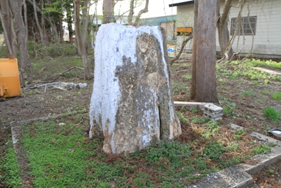 その後ご一行は芦沢、野黒沢を過ぎて荻袋御小憩所にお着きになり、興業社の開墾場や躍龍石という珍しい化石を御覧になられました。興業社の開墾は長瀞村の寒河江季三という人が尾花沢、長瀞、林崎、東根諸村の民と協同して開墾していたもので、この日は数百人の農夫が畑を耕しているところを御覧に入れました。またこの日天覧に供した躍龍石とは玉野村粟生の名主生田十兵衛が玉野原を開墾しようと水源調査をした時、粟生で発見した刺楸(ハリキリ)の木の化石のようです。これを明治14年7月郡内から延人数4000人の人夫を徴発して荻袋御小憩所まで運搬したもので、発見当時長さ三丈、直径五尺もありましたが運搬の途中二つに折れてしまいました。これを継いで一本として天覧に供するのは恐れ多いということになり、ありのままの姿で二本として土を高く盛上げた上に立ててご覧に入れました。陛下はこれを躍龍石と命名され御興深くご覧になられました。折れた石二本の中一本はその後誰かが庭石として運び去ってしまい今は残り一本だけになっています。この石を持っていくと貧乏になると言い伝えられています。