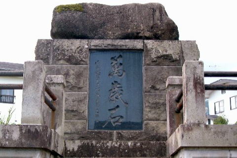 この石は現在地の東方約100mの路傍にあった。出征者はこの石の上に立って、送ってきたむら人のばんざいの声に応え、最後の挨拶をするのを例とした。これが萬歳石の由来である。
