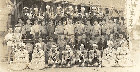 大正天皇御大典記念。熊野神社境内神明鳥居奉納。奴、鹿子踊。 |