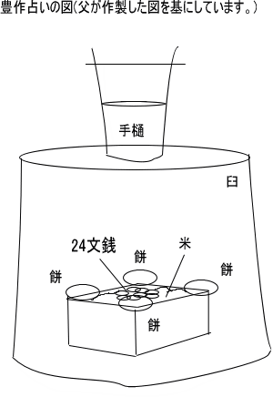 次に若水で豊作占いを行います。一升枡に米を一杯入れ、枡の四つ角に暮れについた餅を載せます。さらに中央には24文の銭を載せます。餅をつき終わった臼をこの枡の上からかぶせ、臼の上に若水を組んだ手桶を載せます。升の下には藁を敷きます。手桶の手には炭とゆずり葉を水引で結びつけます。臼の周囲には豆殻を置きます。置き場所は清掃した庭の隅に置きます。そしてて拝礼します。拝礼は3日間続けます。