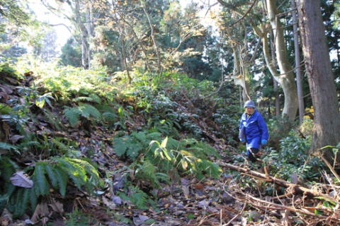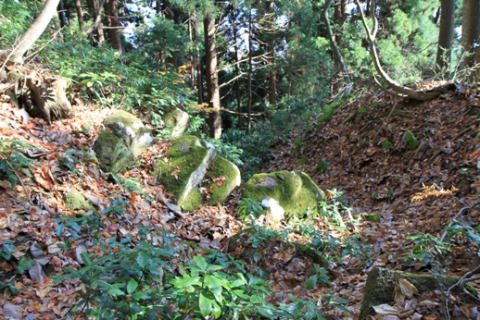 北楯からの上がり口にも通路東口に大岩を配置して塞ぎ、西端に堅堀を落としています。北楯へは西端から北へ折れて、斜面を直接上る構造になっています。
