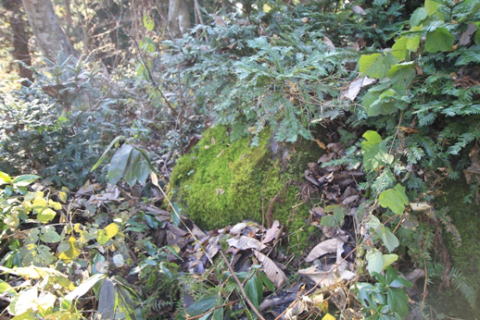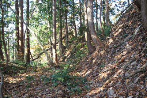 東斜面を北へ斜めに登ると虎口にでます。虎口は前面を大岩で塞ぎ、南隣の山を内側へ食い違いに堀切って弗(カザシ)にして通路を通しています。虎口下付近から南へ山を越えて降りると急斜面に囲まれた平場があります。馬隠し場といっています。北楯側は深さ7mに削り取られ、南側には浅い土塁があります。土塁との問に長さ12m、幅2mの空堀があります。この空堀に沿った幅4mの通路が西に10m進んで、西側25mの腰曲輪に下りています。平場の周囲には一段低く細い平場が帯状に取り巻いています。