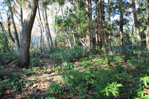 が、今は切り株しか残っていません。山上の平場から敵を弓矢や鉄砲で撃ったと伝えられています。北東角にある虎口は内側をL字形に削り石垣を作り、外側を外食い違いに削平して弗を作っています。虎口下には段状の平場があります。また北西角の虎口下には御前清水があり、湯の入り温泉道に通じています。曲輪周囲は一段低くなった幅約2mの削平地に取り囲まれています。