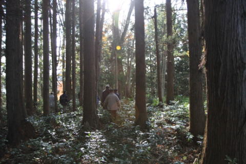 熊野神社境内の周囲は楯在家、おくまんさまの屋敷と呼ばれ、無数の大小の削平地が残っており、戦乱時の臨時の居館であったと思われます。また境内入り口の烏居手前から、楯に登る道と山裾を回って北楯に上る北奥の院道があり、この両側にも多くの腰輪や平場が見られます。参道側の境内付近には終戦頃まで、畝形塞や馬出しと思われる空堀がありました。